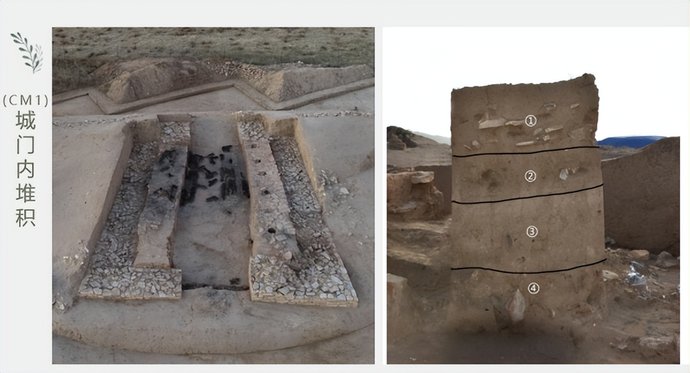 石门墕地点初步发现大型墩台与城墙围合的城防设施遗迹,具体形制尚不清楚。城墙圪垛地点发现了遗址东城墙与城门,城门由东、南、北三个“品”字型布局的大墩台构成,东墩台为半圆形直径21.5米,南、北墩台均为方形,边长约25米,规模宏大。