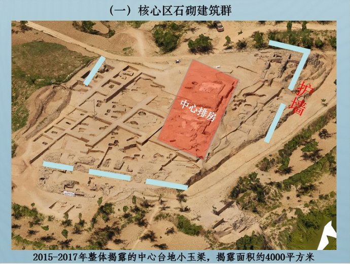 小玉梁地点为遗址核心建筑区,边缘砌筑护坡,中心建造大型五连间排房建筑,排房建筑前面为中央广场。