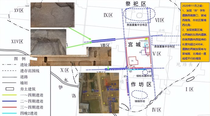 “十三五”以来,在聚落考古理念的指导下,考古工作逐步揭开了二里头遗址的多网格式布局。在此基础上,2021年以来陆续揭露了多处城市道路和道路两侧夯土墙,包括宫城北侧道路上的门道、宫城西部围墙,并发现宫城西侧道路夯土墙向北延伸200余米,据此推测已知作坊区、宫殿区、祭祀区以西至少各存在一个分区。