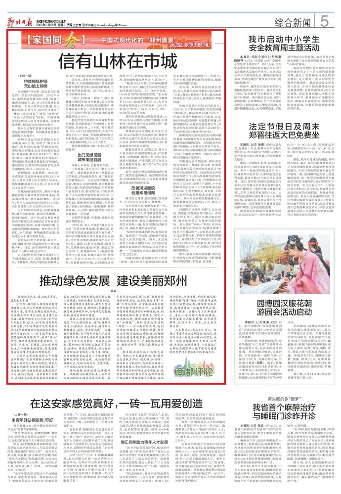 习近平总书记在党的二十大报告中强调:“必须牢固树立和践行绿水青山就是金山银山的理念,站在人与自然和谐共生的高度谋划发展。”这为我们持续推动绿色发展指明了方向、提供了遵循。具体到当下的郑州,我们要立足城市发展实际和群众需求,切实践行绿水青山就是金山银山的理念,加快发展方式绿色转型,深入推进环境污染防治,提升生态系统多样性、稳定性、持续性,积极稳妥推进碳达峰碳中和,打好绿色发展组合拳,推进美丽郑州建设。