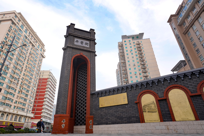 站在平等街北口,首先映入眼帘的是一座8米高的青砖三角柱形砖牌式仿古建筑,与南侧商代王城遗址城垣相呼应。