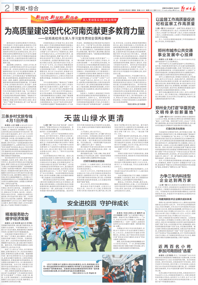 教育是每年全国两会都绕不开的热词,今年的政府工作报告强调,促进教育公平和质量提升,推进高等教育创新,再次引发广大教育者的关注,反响热烈。连日来,全省驻郑高校师生密切关注全国两会动态,深入学习贯彻全国两会精神特别是习近平总书记重要讲话精神,纷纷表示将牢牢把握高质量发展这一首要任务,以强烈的政治责任感和历史使命感,为高质量建设现代化河南贡献更多教育力量。