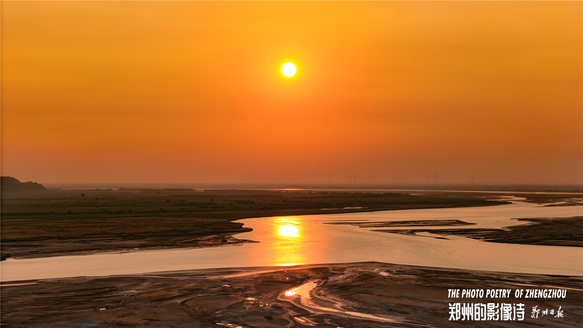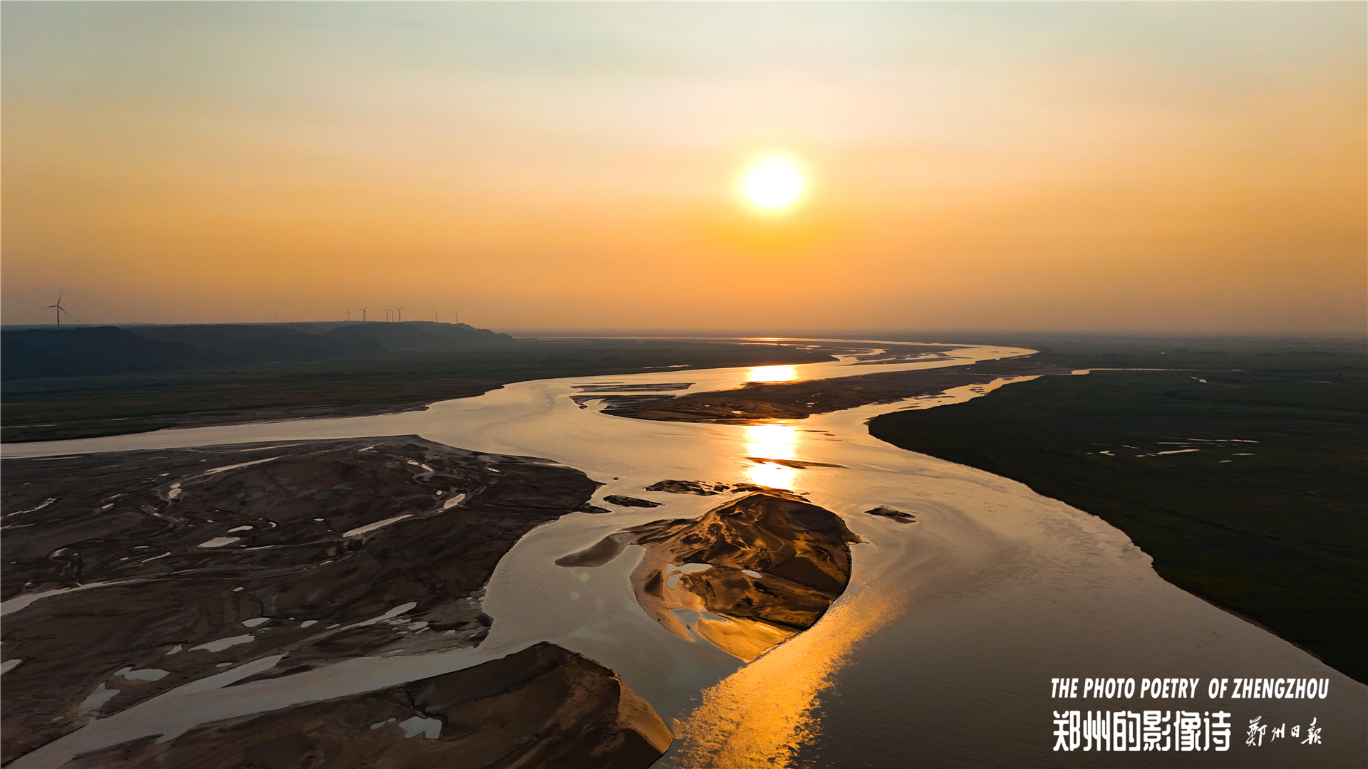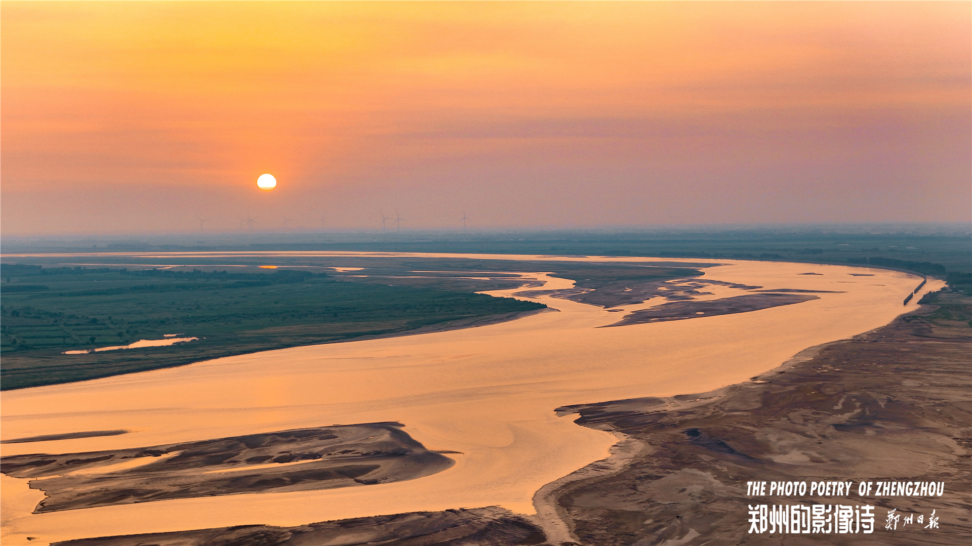 夏日傍晚,晚霞渲染在天空,黄河倒映着落日余晖。浮光跃金,夕阳为黄河水镀上金色光芒,邙岭上风车转动,诉说着新时代的黄河故事。摄影 马健 8月14日|黄河鸿沟段