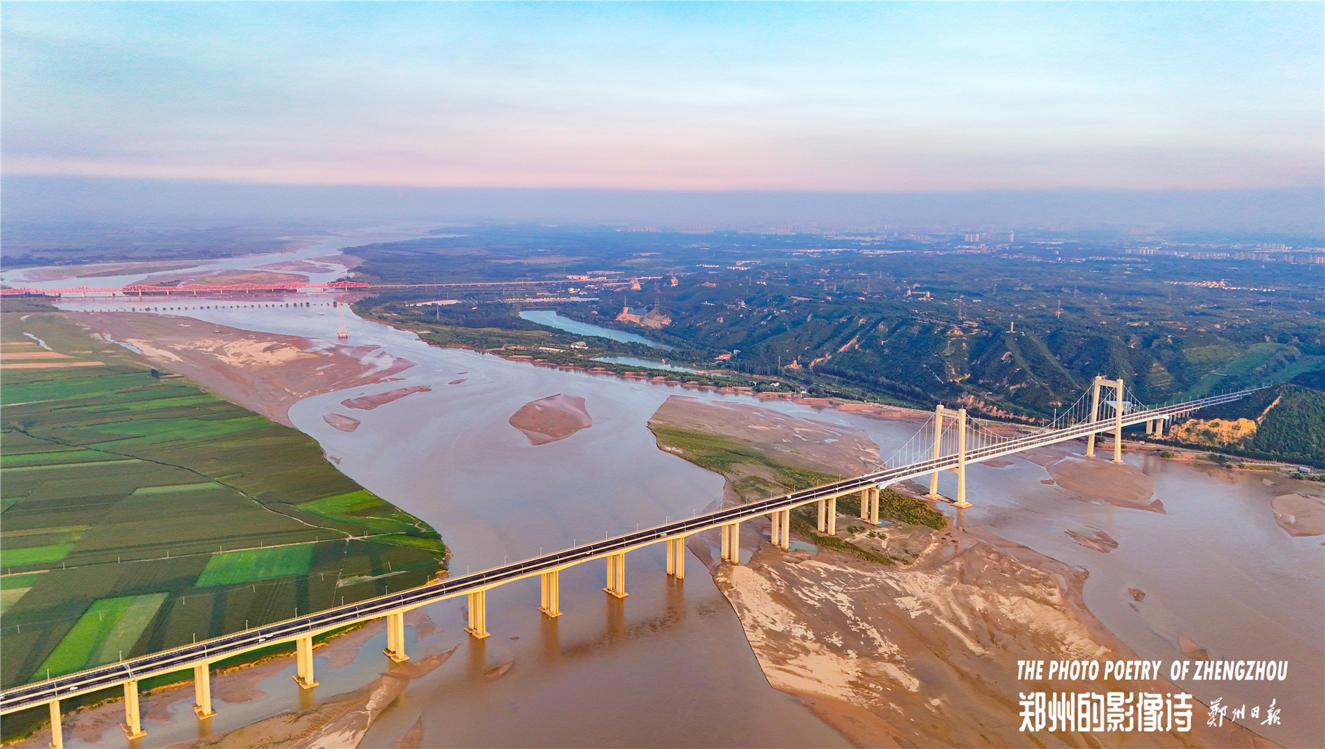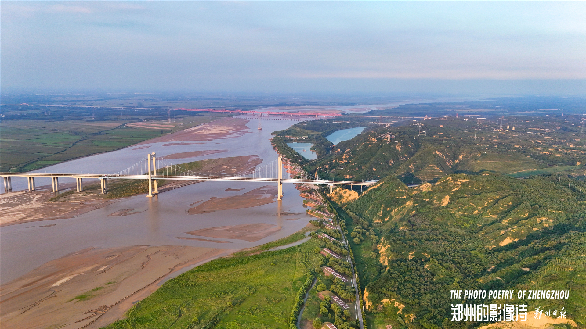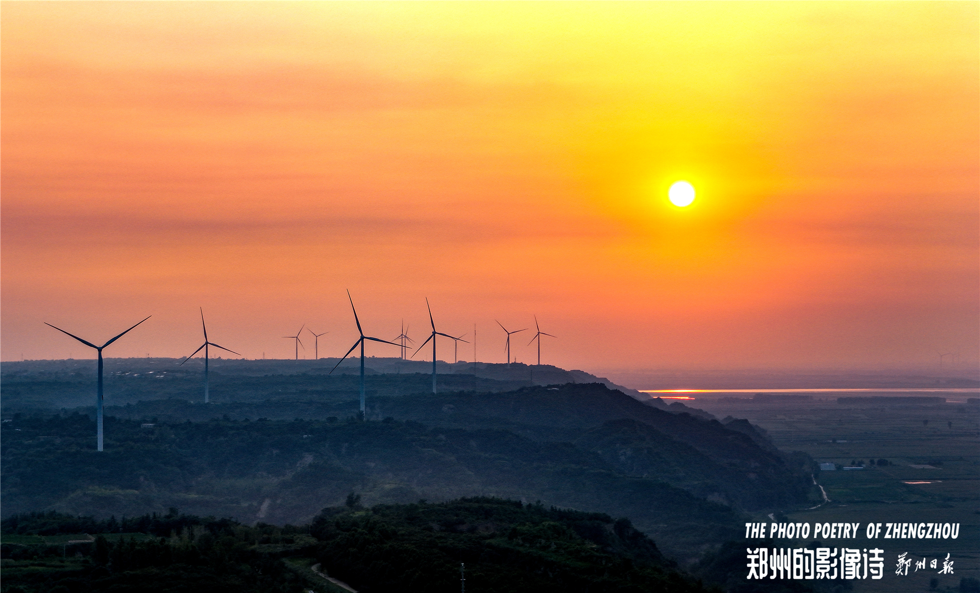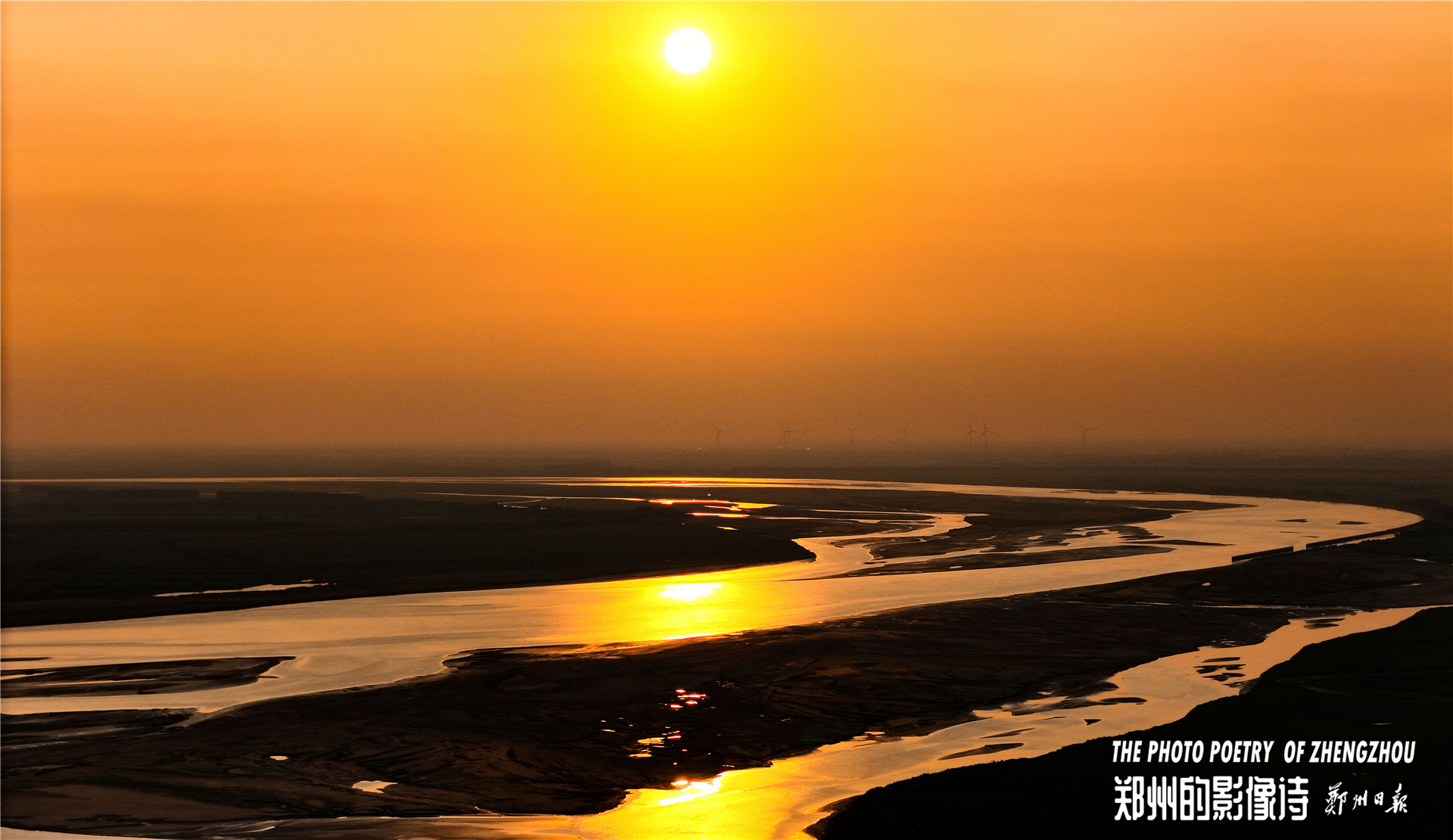 夏日傍晚,晚霞渲染在天空,黄河倒映着落日余晖。浮光跃金,夕阳为黄河水镀上金色光芒,邙岭上风车转动,诉说着新时代的黄河故事。摄影 马健 8月14日|黄河鸿沟段
