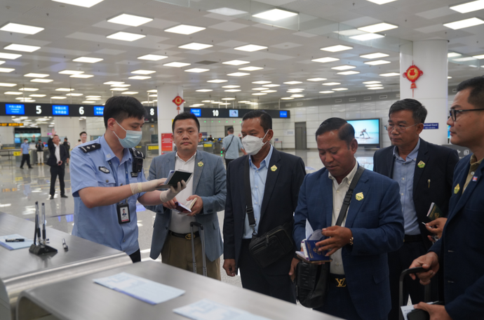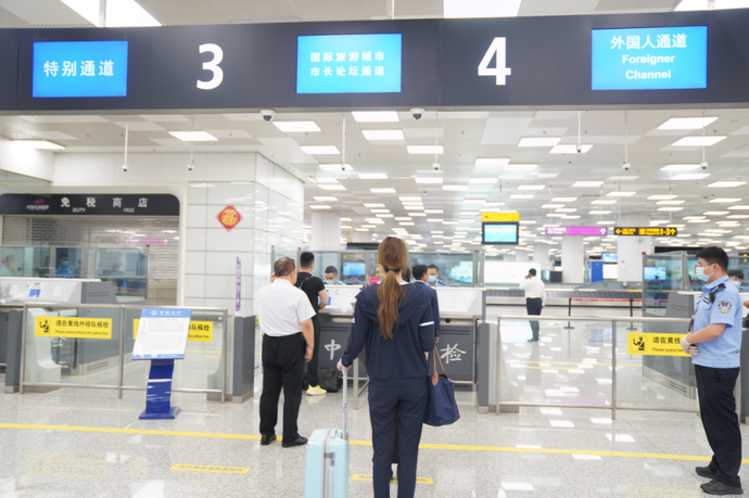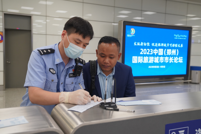 9月3日上午11时许,新郑国际机场迎来一批2023中国(郑州)国际旅游城市市长论坛参会嘉宾,来自柬埔寨金边国际航班上共16人在郑州边检站民警的高效验放下顺利入境。