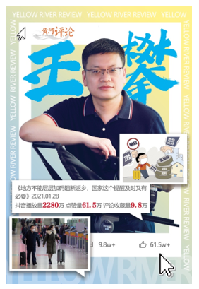 短视频评论全网播放量已超5亿次,产生了多个千万级播放量爆款,其中2021年1月的短视频《地方不能层层加码阻断返乡,国家这个提醒及时又有必要》以犀利的文字和生动的语言,受到了广大网友的共鸣,在抖音平台播放量达2280万,点赞量超61.5万。
