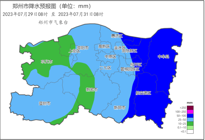 图2 2023年7月29日08时至31日08时郑州市降水量预报图(单位:mm)