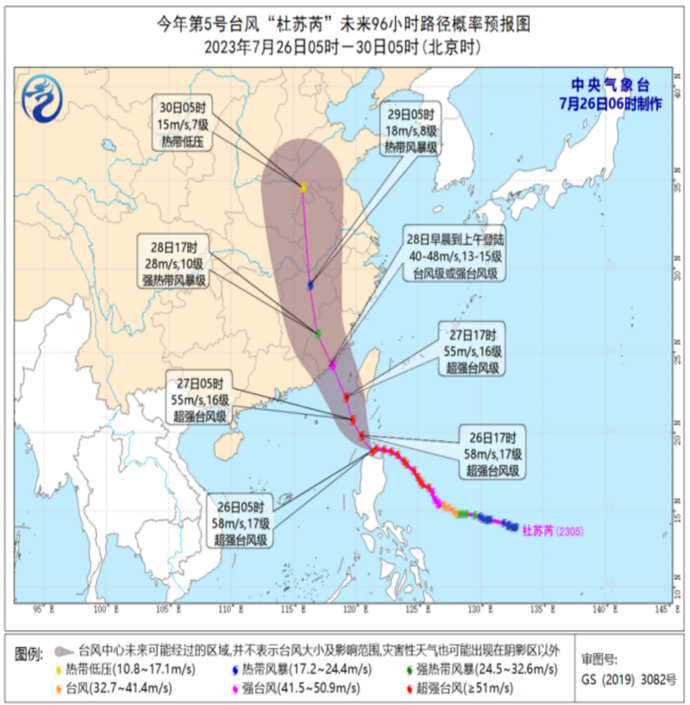 记者从郑州市气象部门获悉,2023年第5号台风“杜苏芮”(DOKSURI)于7月21日08时生成。目前,“杜苏芮”已发展为超强台风,26日15时台风中心位于我国台湾省鹅銮鼻偏南方大约280公里的巴士海峡海面上,中心附近最大风力有16级(55米/秒),中心最低气压930百帕。