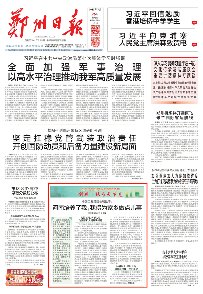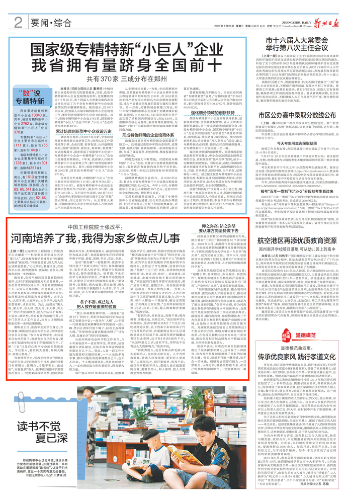 为弘扬科学家精神,推动郑州高质量发展,本报开设“大力弘扬新时代科学家精神——创新·敢为天下先”专栏,深入一线,为您讲述郑州本土科学家胸怀祖国、服务人民、勇攀高峰、集智攻关的动人故事,在全社会营造尊重知识、崇尚创新、尊重人才、热爱科学、献身科学的浓厚氛围,推动创新创造成为时代风尚。
