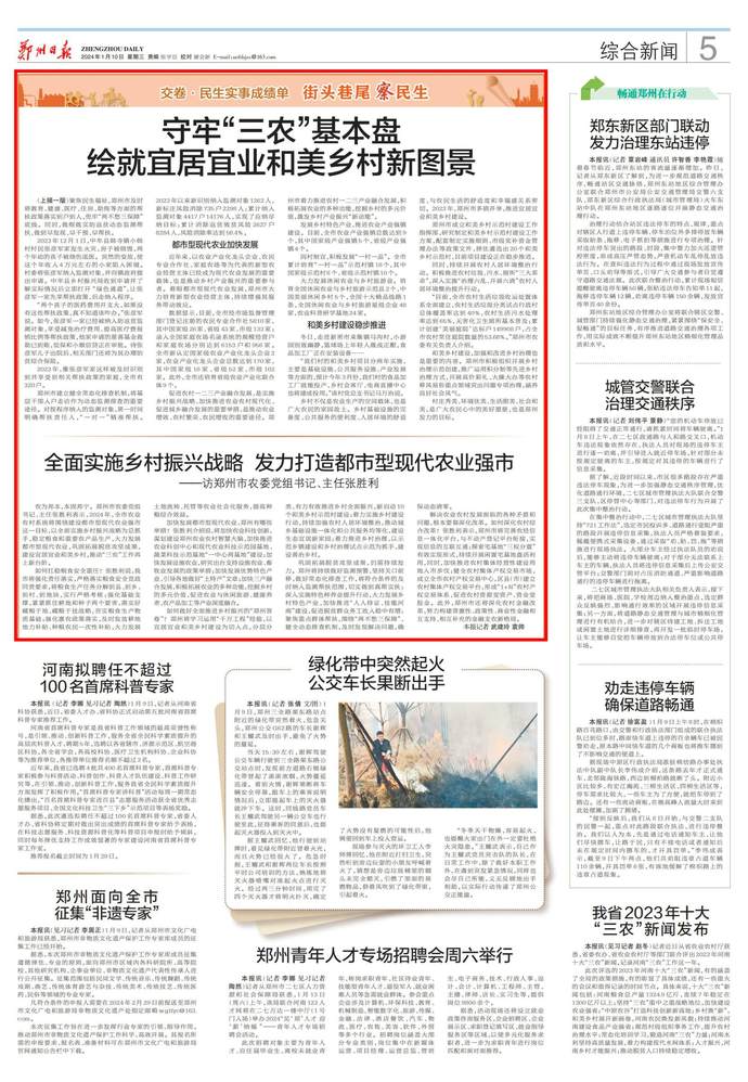 如何做好全面推进乡村振兴的“郑州答卷”?郑州将学习运用“千万工程”经验,以宜居宜业和美乡村建设为切入点,分层分类、有力有效推进乡村全面振兴,新启动10个和美乡村示范村建设;着力实施乡村建设行动,持续加强农村人居环境整治,推动城乡基础设施一体化和公共服务均等化,建设生态宜居新家园;着力推进乡村治理,以示范乡镇建设和乡村治理试点示范为抓手,建设善治乡村。