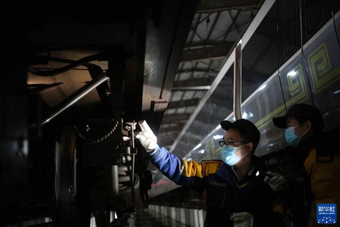 12月15日,郑州地铁集团有限公司运营分公司通号中心通号三室检修工人邵艳涛(左)与崔志超进行地铁检修作业。新华社记者 吴刚 摄