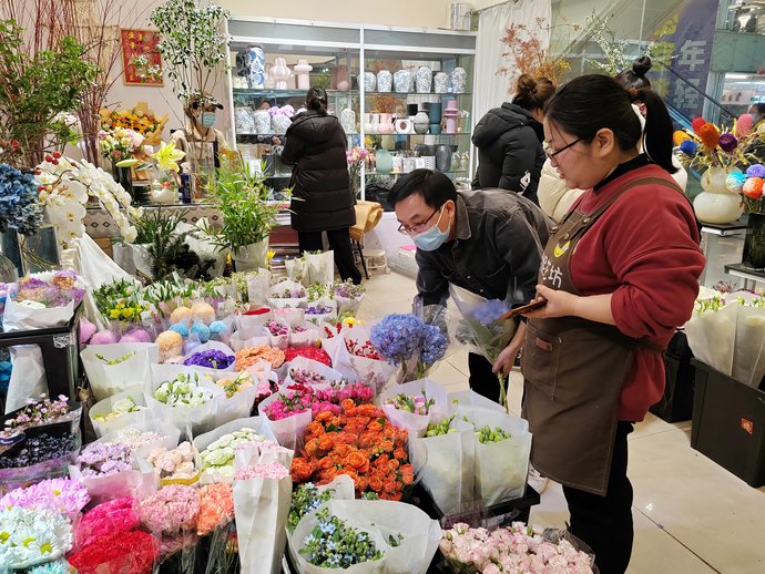 除了腊梅,百合、玫瑰依然是市场上很受欢迎的花。在另一位花店经营者沈先生的花店里,上午刚从昆明空运回来的百合和玫瑰还没来得及被摆放整齐,就已经售出了不少。“这些多头玫瑰也已经被一个老客户在微信上预订了。”沈先生指着地上的一堆玫瑰说,“玫瑰、百合在大众心中永远是爱情和美好的象征,因此这两种花的销量一直都很好。”