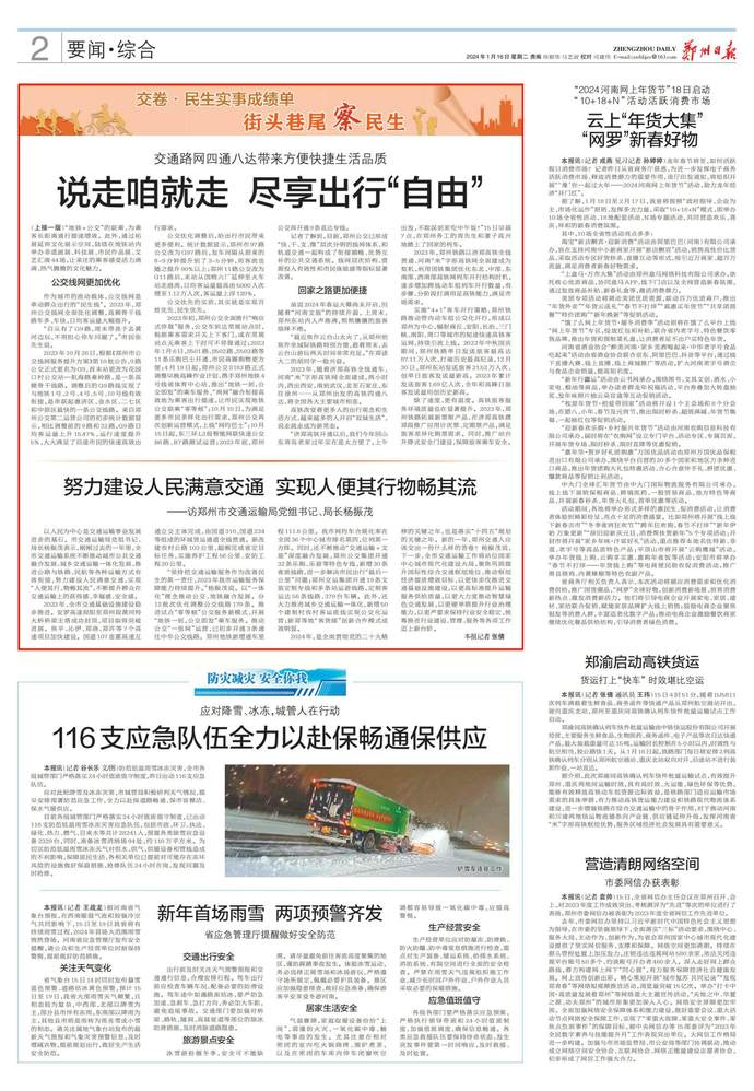 “坚持把交通运输服务作为改善民生的第一责任,2023年我市运输服务保障能力持续提升。”杨振茂说。以“一体化”理念推动公交、地铁融合发展。分12批次优化调整公交线路179条。推进试点“零等候”公交服务新模式,开展“地铁一到,公交即发”乘车服务。推动公交“一张网”运营,已初步开通3条通往中牟公交线路。郑州地铁新增通车里程111.8公里。我市网约车合规化率在全国36个中心城市排名第四,位列第一方阵。同时,还不断推动“交通运输+文旅”深度融合发展,郑州公交集团开通32条乐购、乐游等特色专线,新增30条夜班线路,进一步解决市民出行“最后一公里”问题;郑州交运集团开通19条文旅定制专线和多条站运游线路,定制客运达56条线路、379台车辆。此外,还大力推进城乡交通运输一体化,新增50个建制村农村客运班线实现公交化运营;新郑等地“客货邮”创新合作模式成效明显。
