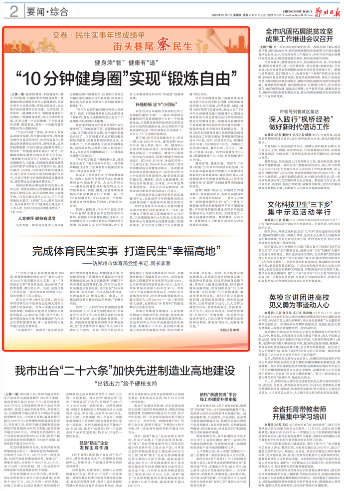 “‘市内主城区更新健身路径200条,新建智能健身驿站20个’被列入郑州市2023年度市重点民生实事。这一‘体育民生实事’项目的选定,充分体现了百姓的意愿、群众的心声。目前,这些任务已全部完成。”郑州市体育局党组书记、局长李雅开门见山地说。
