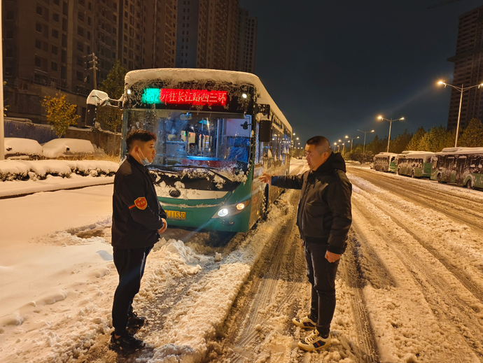 12月11日,00:00,郑州公交第二运营公司各级管理群中,发布安全指令,所有安管人员,全部坚守在岗,此时,所有公交车已全部运营结束,场区内薄薄的积雪上,一串串穿梭的脚印,是末班车车长在进行收车后的安全检查。