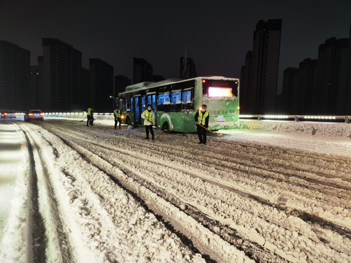 风雪中,他们迎着寒风,躬着身子,抡起铁锹,全力清除着路上的积雪,并奋力地抛洒着融雪剂,不仅保障了公交车辆的运营安全,也大大方便了行人车辆安全出行。凌晨5点30分,公交人便已经到达各个公交场站,并积极投入到清除积雪的工作中,保障早晨的首班车能够正常发出。运营车长不仅对所有车辆制动、转向系统和雨刷器、各类灯光及油、电、水、气路等方面进行了重点检查,还提前预热车辆、开启暖风装置,保障运营车辆温暖舒适。清晨6点,各场区全部清扫干净,车辆全部发出。