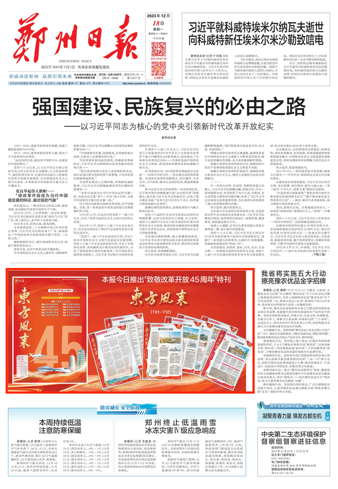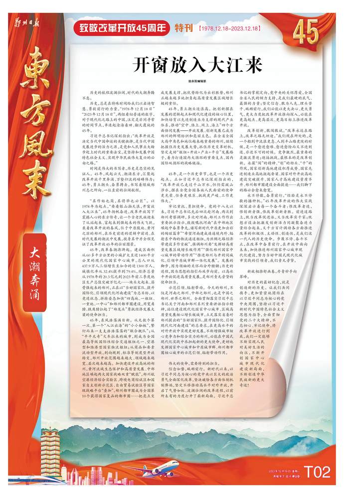时间是伟大的书写者,历史是忠实的见证人。45年,风起云天、潮涌东方,汇聚起改革开放千里奔涌、万壑归流的磅礴伟力;45年,勇立潮头、奋勇搏击,书写着绿城郑州志之所向、一往直前的壮阔航程。