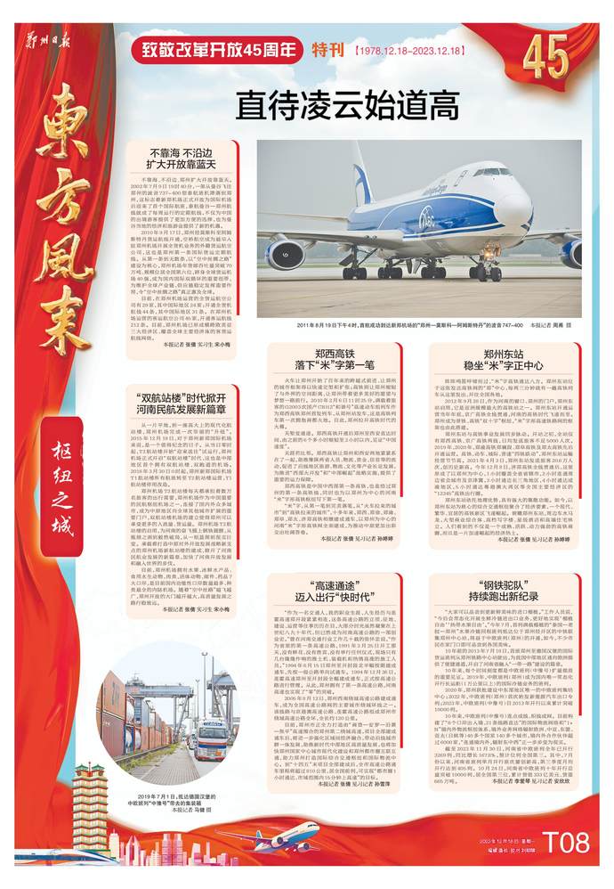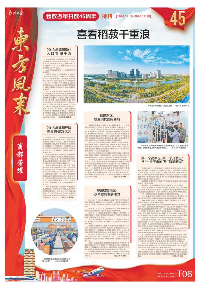 45年,东风浩荡满目新。从无数个第一次、第一个“入江出海”的“小小舢板”,繁衍而来一支支浩浩荡荡的“联合舰队”;从“平平无奇”火车拉来的城市,到成为全国最高等级国际性综合交通枢纽之一、空港型和陆港型国家物流枢纽;从商品和要素流动型开放,到向规则、标准等制度型开放转变,郑州开放范围越来越大、领域越来越宽、层次越来越高。加快建设开放高地的郑州,黄河流域生态保护和高质量发展、中部地区崛起两大国家战略双重“赋能”,郑州航空港经济综合实验区、跨境电商综试区和国家自主创新示范区、自由贸易试验区等国家级战略平台“叠加”,郑州都市圈成为全国第10个获得国家复函的都市圈……把亮点变成发展支撑,把优势转化为出彩胜势,郑州正越来越多地担负起高质量发展区域增长极的重任。