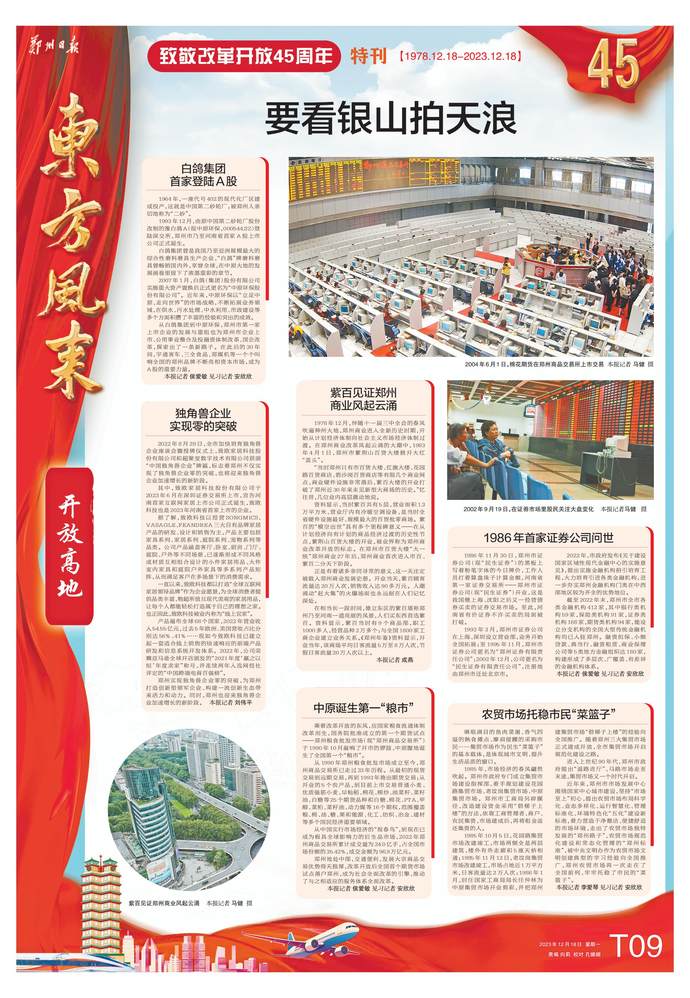 “其作始也简,其将毕也必巨”。以1978年为起点,“要看银山拍天浪,开窗放入大江来”,45年扬帆奋进,改革开放写下震撼人心的东方传奇,让一个古老民族迎来了从站起来、富起来到强起来的伟大飞跃。乘着改革开放的春风,位于中原腹地、黄河之滨的郑州,在历史前进的逻辑中前进、在时代发展的潮流中发展,投身其中并全程见证了改革开放45年的壮丽图景。
