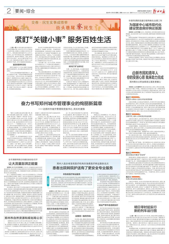 “紧盯人民群众身边的关键小事,唱响‘百姓城管、服务百姓’主旋律。集中开展‘郑点亮’‘郑路平’‘郑好停’专项工作,点亮道路196条128.8公里,完成道路中小修50.2万平方米,治理提升窨井盖5.69万座,盘活新增共享停车泊位59.3万个……”回顾盘点过去一年的工作,郑州市城市管理局党组书记、局长杜建强话语铿锵,“让人民群众的获得感、幸福感和安全感成色更足、感受更强,是我们一切奋斗的出发点和落脚点,也让我们拥有了最可靠、最深厚、最持久的力量源泉。”