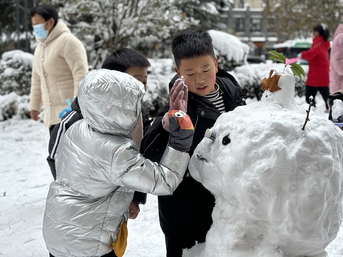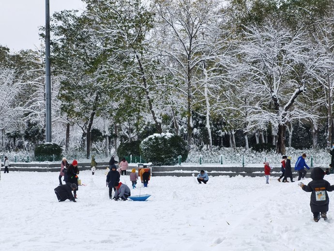 翩然而至的雪花为城市增添了独特的韵味,银装素裹的美景给大家带来了意外的惊喜。在城市道路之外的各处广场上,不影响车辆及行人出行的区域所留下的积雪,成了孩童们的一方“快乐天地”。