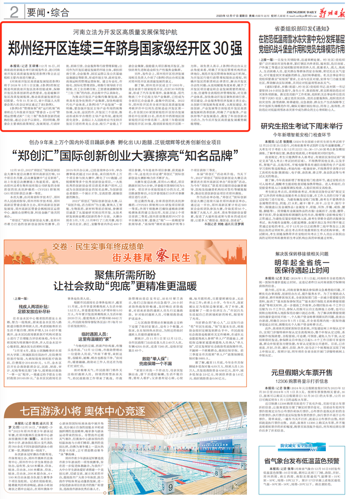 据了解,郑州经开区成立于1993年,是全省首个国家级经开区,历时30年的发展,形成了汽车及零部件、装备制造、现代物流三个千亿级主导产业集群,已经成为全省百亿企业最多、最集中的区域。2022年,郑州经开区在全省开发区高质量发展考核评价中位列先进制造业开发区第一名;在全国230家国家级经开区综合发展排名中位居第23名,首次在中西部地区国家级经开区中排名第三,连续三年稳居国家级经开区30强,稳居国家级经开区第一方阵。该负责人表示,《条例》的出台从立法角度来看,明确了开发区管理机构的法律地位,规范开发区管理体制和运行机制,为开发区行使行政管理权限依法授权,明确开发区的职责和法律责任,解决开发区合法性问题;从放权赋能角度来看,赋予了开发区项目建设和企业发展需要的规划、土地、住建等全流程经济管理权限,对完善产业体系,加快推动开发区聚焦招商引资、项目建设、企业服务等经济发展主责主业;从创新引领发展角度来看,从规划建设、科技创新、产业发展等方面促进开发区高质量发展和改革创新,明确了产业服务、产业扶持等产业发展重点,激发了科技创新动力活力,为今后开发区高质量发展蓄势赋能增能。