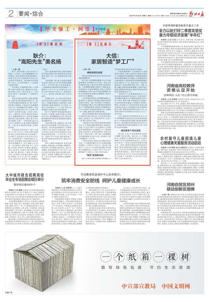 本报特推出【厚文强工·问郑】系列报道,通过对和郑州有关历史名人的故里实地走访和现实价值挖掘,展示郑州悠久厚重的历史文化底蕴,同时,对郑州工业、郑州品牌进行深入报道,展现郑州发展新质生产力、强产业促发展的实力与活力。