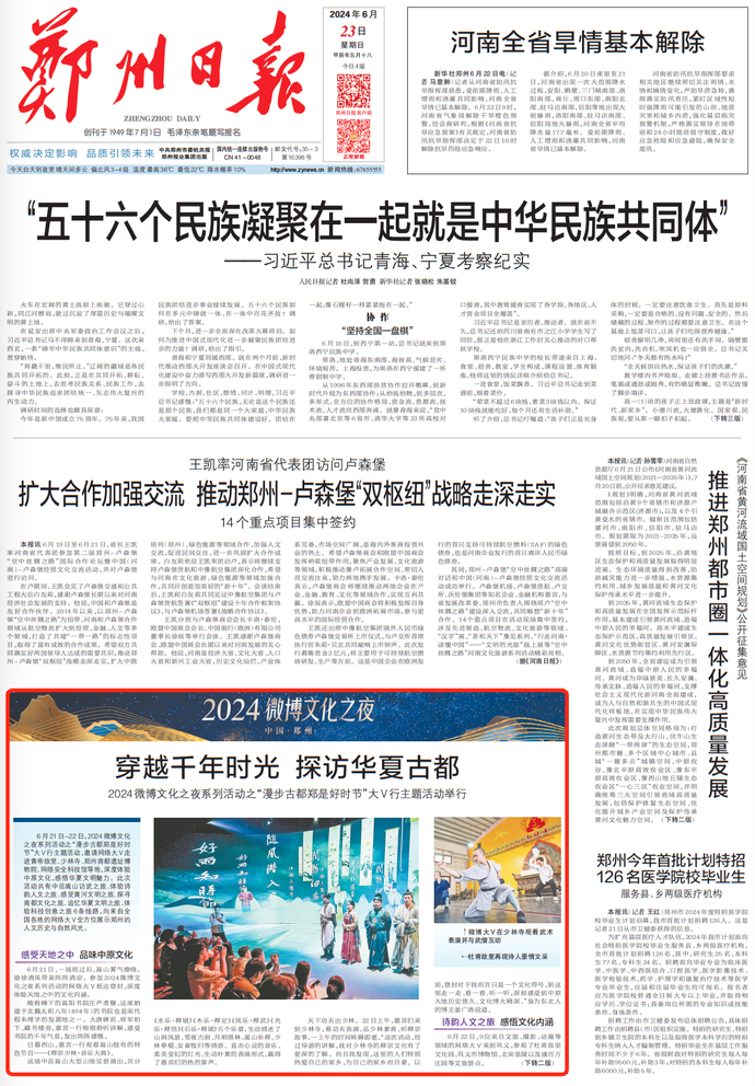 6月21日~22日,2024微博文化之夜系列活动之“漫步古都郑是好时节”大V行主题活动,邀请网络大V走进黄帝故里、少林寺、郑州商都遗址博物院、网络安全科技馆等地,深度体验中原文化,感悟华夏文明魅力。此次活动共有中岳嵩山访武之旅、体验诗韵人文之旅、感受黄河文明之旅、探寻商都文化之旅、追忆华夏文明之旅、体验科技创意之旅6条线路,向来自全国各地的网络大V全方位展示郑州的人文历史与自然风光。