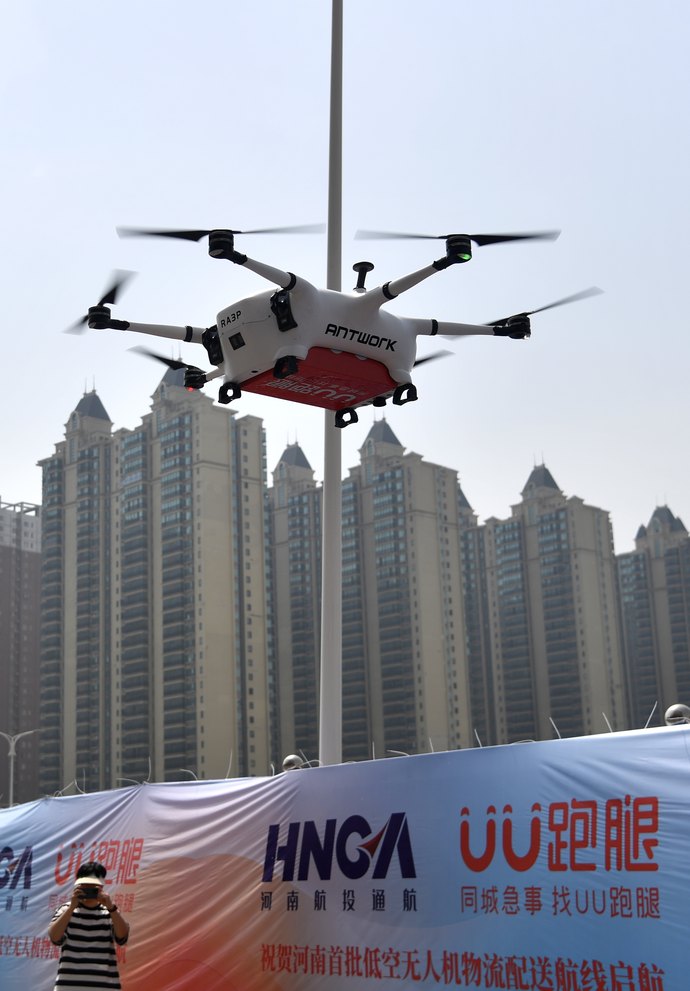 5月18日10时,郑州赛博数码广场,跑男孟卫严将一部手机放进一架原地等候的无人机机舱,接到起飞指令后,无人机徐徐升空,越飞越高,随后向8.7km外的目的地新天地通讯大厦飞去。这意味着河南首条低空无人机物流配送航线正式启动。郑州物流行业迎来无人机同城配送新时代。
