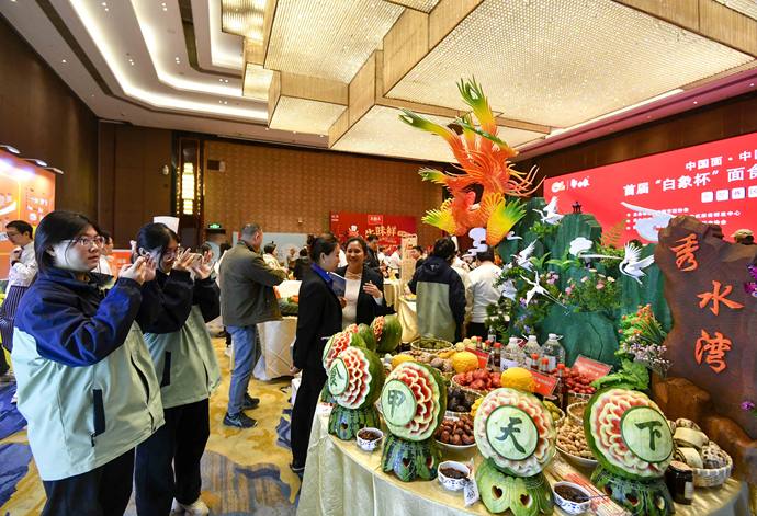 红绿相间的京津特色捞面、油润鲜亮的过油肉拌面、色泽金黄的非遗大刀金丝羊汤面……大赛现场,色香味美、品类繁多的各种面食让人眼花缭乱。圆润饱满的鲍鱼酥、栩栩如生的狮子滚绣球、娇艳欲滴的荷花酥……各类色彩斑斓的面点更是花式齐全。一桌桌充满艺术气息的面食、面点展品展现出参赛选手的高超技艺水平。