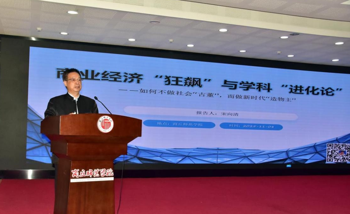中国商业经济学会副会长、中国商业史学会副会长、河南省商业经济学会会长宋向清以《商业经济“狂飙”与商科教育“进化论”——如何不做社会“古董”,而做新时代“造物主”》为题,指出:商业世界正在上演“速度与激情”,商科教材与其被“卷死”,不如一起“进化”;商科教学,与其把学生培养成“装知识的U盘”,不如把学生打造成“能解决问题的WiFi”。
