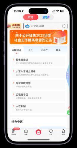 “郑好办”APP6.0版本首次实现“政务”与“生活”两大核心板块的清晰分立。政务首页,只为高效办事而生;生活首页,营造沉浸式生活服务体验。两者界面独立、功能聚焦,互不干扰。用户可自主切换,轻松应对多样需求。