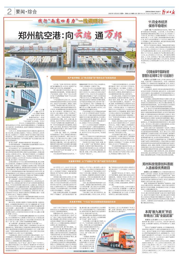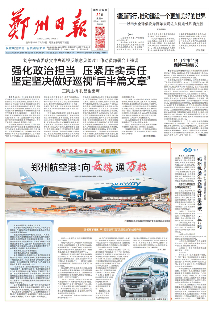 12月21日,郑州新郑国际机场年货邮吞吐量首次突破100万吨,成为继上海浦东、广州白云、深圳宝安、北京首都之后,全国第五个、中部首个跻身“百万吨级”的航空货运枢纽机场。这标志着郑州正式迈入规模化、网络化的全球航空货运枢纽新阶段,“空中丝绸之路”节点功能与核心枢纽地位显著提升。