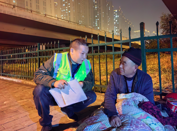 “老乡,冷不冷啊?咋在这躺着呢?”“俺是出来找活儿哩!家里俩孩儿呢!”“这几天有雨要降温啊,又冷又不安全,去救助站吧,有床有被子有暖气,还能吃口热乎饭。”救助站工作人员在南三环立交桥下,发现一名露宿街头的人员。