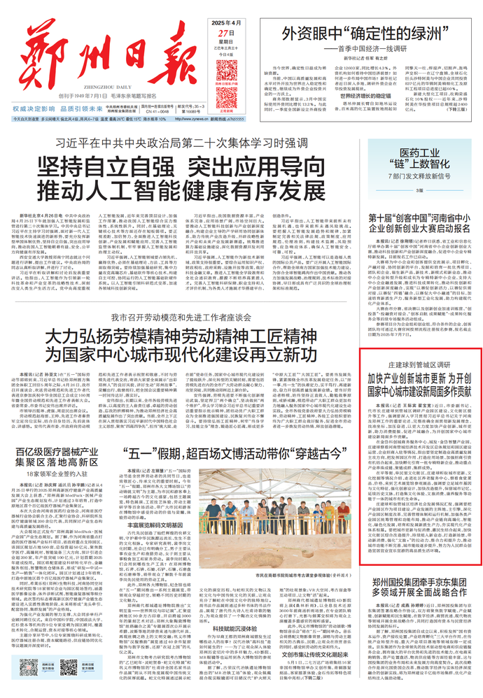 近日,市委副书记、代市长庄建球到管城区调研产业园区建设、文化街区提升等工作,强调要深入学习贯彻习近平总书记关于河南及郑州工作的重要论述,完整准确全面贯彻新发展理念,找准坐标、加压奋进,以更大力度加快产业创新、城市更新,助力消费提振,促进产城融合,为开创国家中心城市建设新局面多作贡献。