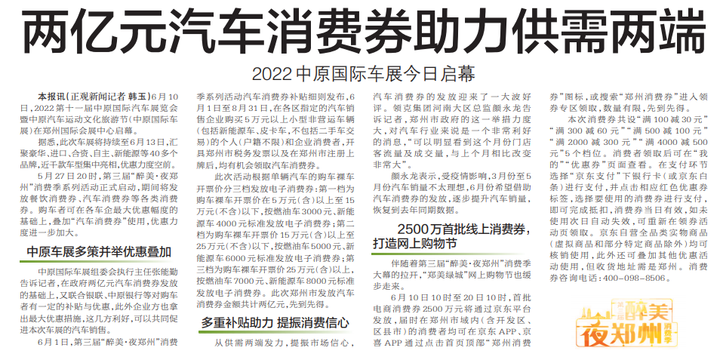5月27日20时,第三届“醉美·夜郑州”消费季系列活动正式启动,期间将发放餐饮消费券、汽车消费券等各类消费券。购车者可在各车企最大优惠幅度的基础上,叠加“汽车消费券”使用,优惠力度进一步加大。(今日《郑州日报》5版)