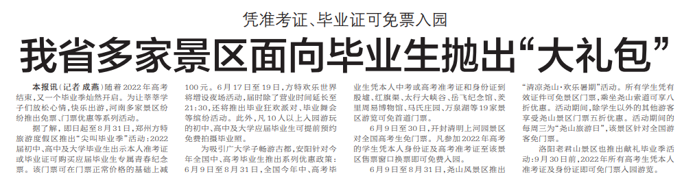随着2022年高考结束,又一个毕业季灿然开启。为让莘莘学子们放松心情,快乐出游,河南多家景区纷纷推出免票、门票优惠等系列活动。(今日《郑州日报》6版)