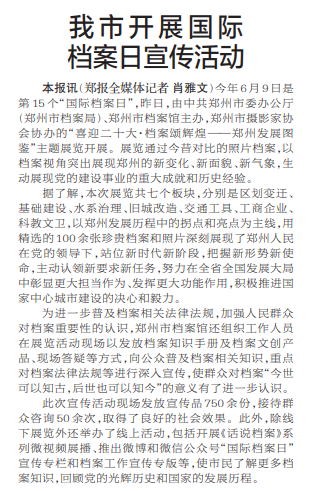 今年6月9日是第15个“国际档案日”,昨日,由中共郑州市委办公厅(郑州市档案局)、郑州市档案馆主办,郑州市摄影家协会协办的“喜迎二十大·档案颂辉煌——郑州发展图鉴”主题展览开展。展览通过今昔对比的照片档案,以档案视角突出展现郑州的新变化、新面貌、新气象,生动展现党的建设事业的重大成就和历史经验。(今日《郑州日报》2版)