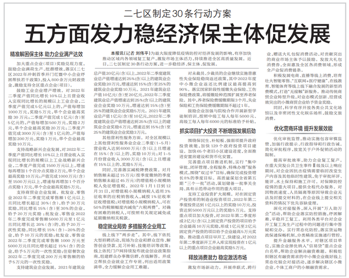 为最大限度降低疫情防控对经济发展的影响,有序加快推动区域内各领域复工复产,激发市场主体活力,持续推进全区高质量发展。近日,二七区制定30条行动方案,进一步稳经济、保主体、促发展。(今日《郑州日报》7版)