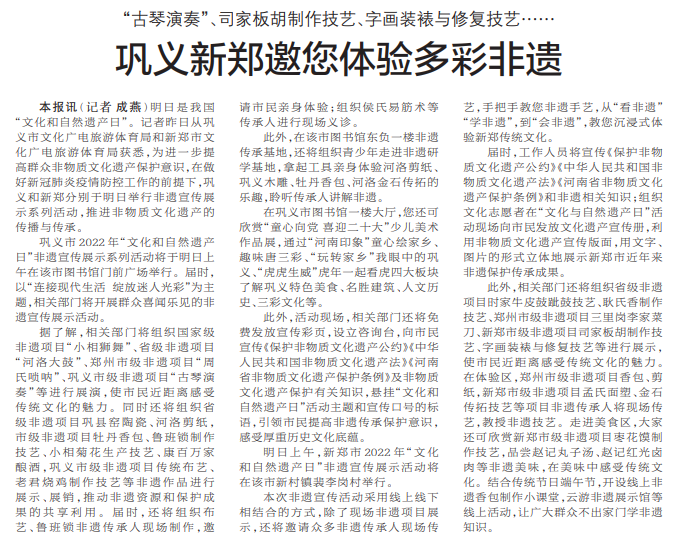 明日是我国“文化和自然遗产日”。记者昨日从巩义市文化广电旅游体育局和新郑市文化广电旅游体育局获悉,为进一步提高群众非物质文化遗产保护意识,在做好新冠肺炎疫情防控工作的前提下,巩义和新郑分别于明日举行非遗宣传展示系列活动,推进非物质文化遗产的传播与传承。(今日《郑州日报》2版)