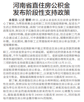 河南省直住房公积金发布阶段性支持政策