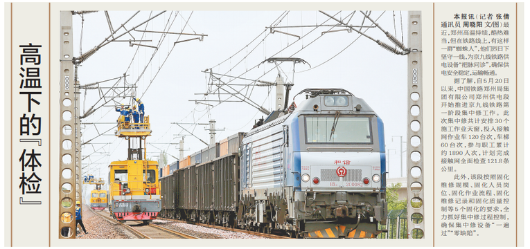 最近,郑州高温持续,酷热难当,但在铁路线上,有这样一群“蜘蛛人”,他们烈日下坚守一线,为京九线铁路供电设备“把脉问诊”,确保供电安全稳定,运输畅通。(今日《郑州日报》1版)