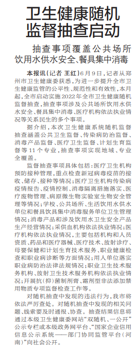 6月9日,记者从郑州市卫生健康委获悉,为进一步提升全市卫生健康监管的公平性、规范性和有效性,本月起,全市启动实施2022年全市卫生健康随机监督抽查,抽查事项涉及公共场所饮用水供水安全、餐具集中消毒、医疗机构依法执业情况等关系民生的多个事项。(今日《郑州日报》5版)