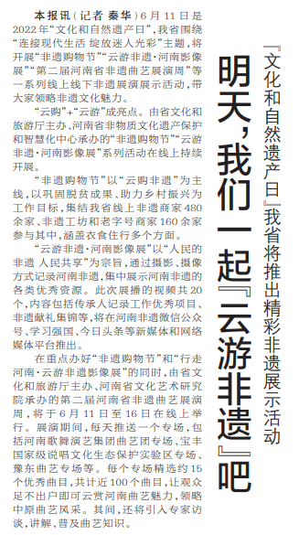 6月11日是2022年“文化和自然遗产日”,我省围绕“连接现代生活 绽放迷人光彩”主题,将开展“非遗购物节”“云游非遗·河南影像展”“第二届河南省非遗曲艺展演周”等一系列线上线下非遗展演展示活动,带大家领略非遗文化魅力。(今日《郑州日报》1版)
