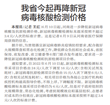 6月10日起,河南进一步降低新冠病毒核酸及抗原检测价格,新冠病毒核酸检测标本混采按照不超过3.4元/人次的标准计费。这是记者6月9日从河南省医疗保障局获得的信息。(今日《郑州日报》2版)