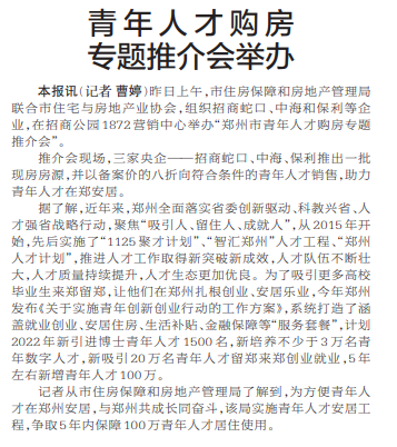 昨日上午,市住房保障和房地产管理局联合市住宅与房地产业协会,组织招商蛇口、中海和保利等企业,在招商公园1872营销中心举办“郑州市青年人才购房专题推介会”。(今日《郑州日报》2版)