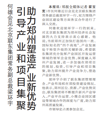 市长何雄近日会见北京联东集团常务副总裁梁环宇一行,双方围绕产业园区建设等方面务实合作进行了深入交流。(今日《郑州日报》1版)