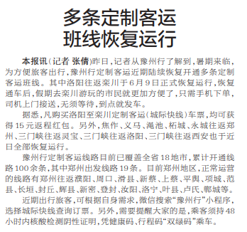 昨日,记者从豫州行了解到,暑期来临,为方便旅客出行,豫州行定制客运近期陆续恢复开通多条定制客运班线。其中洛阳往返栾川于6月9日正式恢复运行,恢复通车后,假期去栾川游玩的市民就更加方便了,只需手机下单,司机上门接送,无须等待,到点就发车。(今日《郑州日报》2版)