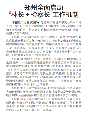 记者从市林业局获悉,郑州市林长办公室、郑州市人民检察院近日印发《郑州市全面推行“林长+检察长”制工作方案》,这标志着我市全面启动“林长+检察长”工作机制。(今日《郑州日报》1版)