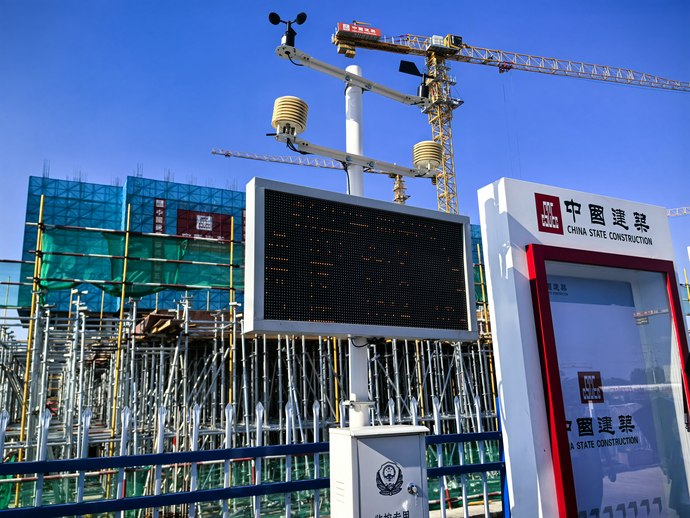 负责项目施工的中海建筑有限公司技术负责人韩建告诉记者:“工地建立了绿色施工管理体系,并制定相应的管理制度与目标:“项目开工后,项目部按照‘八个100%’要求落实部署扬尘治理设施,对现场裸露土方进行了覆盖、洒水、绿化,并在塔吊和高空平台上安装了喷雾装置,当扬尘监控系统数据过高时,我们积极进行洒水降尘,保证工期内扬尘指数符合要求。”说话间,工地大门处,工人启动小型雾炮车进行作业。司机师傅说,这是每天的常态,结合近日的高温、干燥天气,会采取定时、不定时的方式对工地进行洒水降尘。